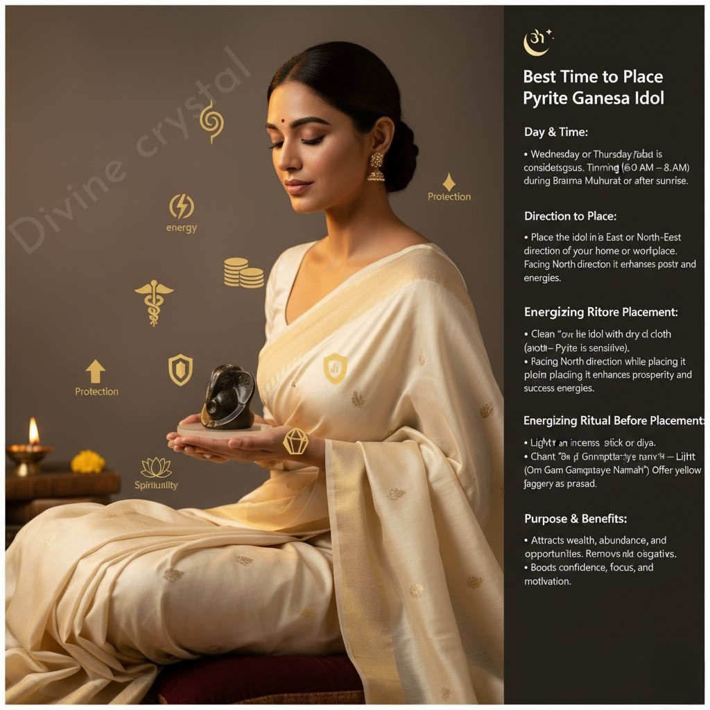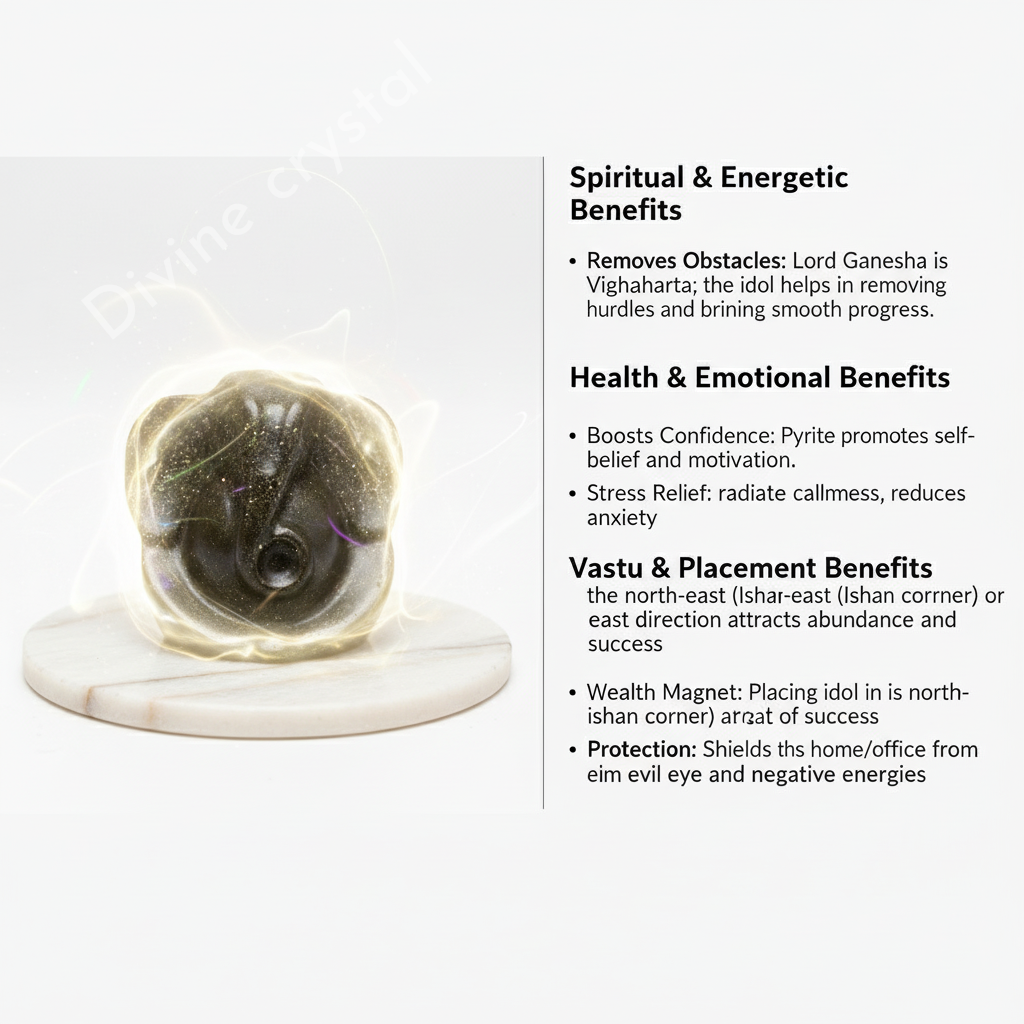Place the Pyrite Ganesh Idol in your living room, office, or meditation space to attract abundance and remove obstacles. It can be used during prayer, meditation, or Vastu correction. An excellent gift for loved ones seeking prosperity and spiritual growth.